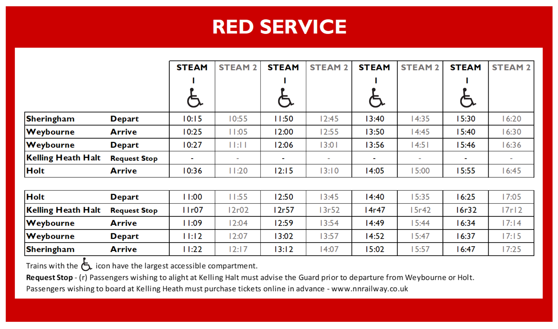 Visit when the RED TIMETABLE is in operation and you can see and travel behind two of our powerful steam locomotives which will be in action hauling trains of restored steam-era carriages.