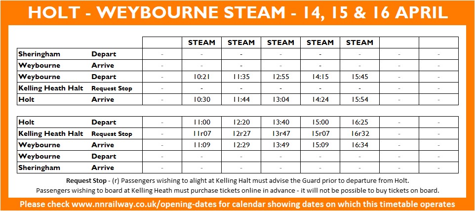 Operational or other considerations may make it necessary to alter, amend or cancel train services and other activities. The North Norfolk Railway cannot be held responsible for any inconvenience or disappointment caused.
