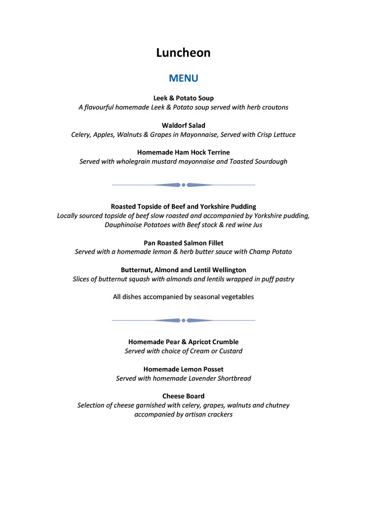 Menus vary according to season; our Bookings Team will contact diners to ascertain menu choices in advance of your visit. We shall be pleased to cater for special dietary requirements – please let us know at the time of booking.